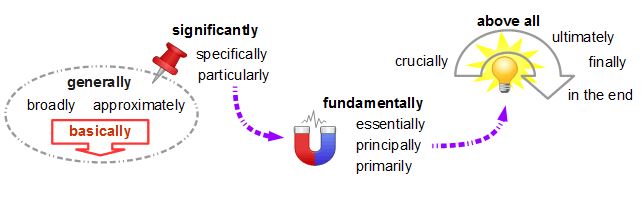 * The terms 'basically', 'generally' and 'broadly' all lead to the idea of overall summary