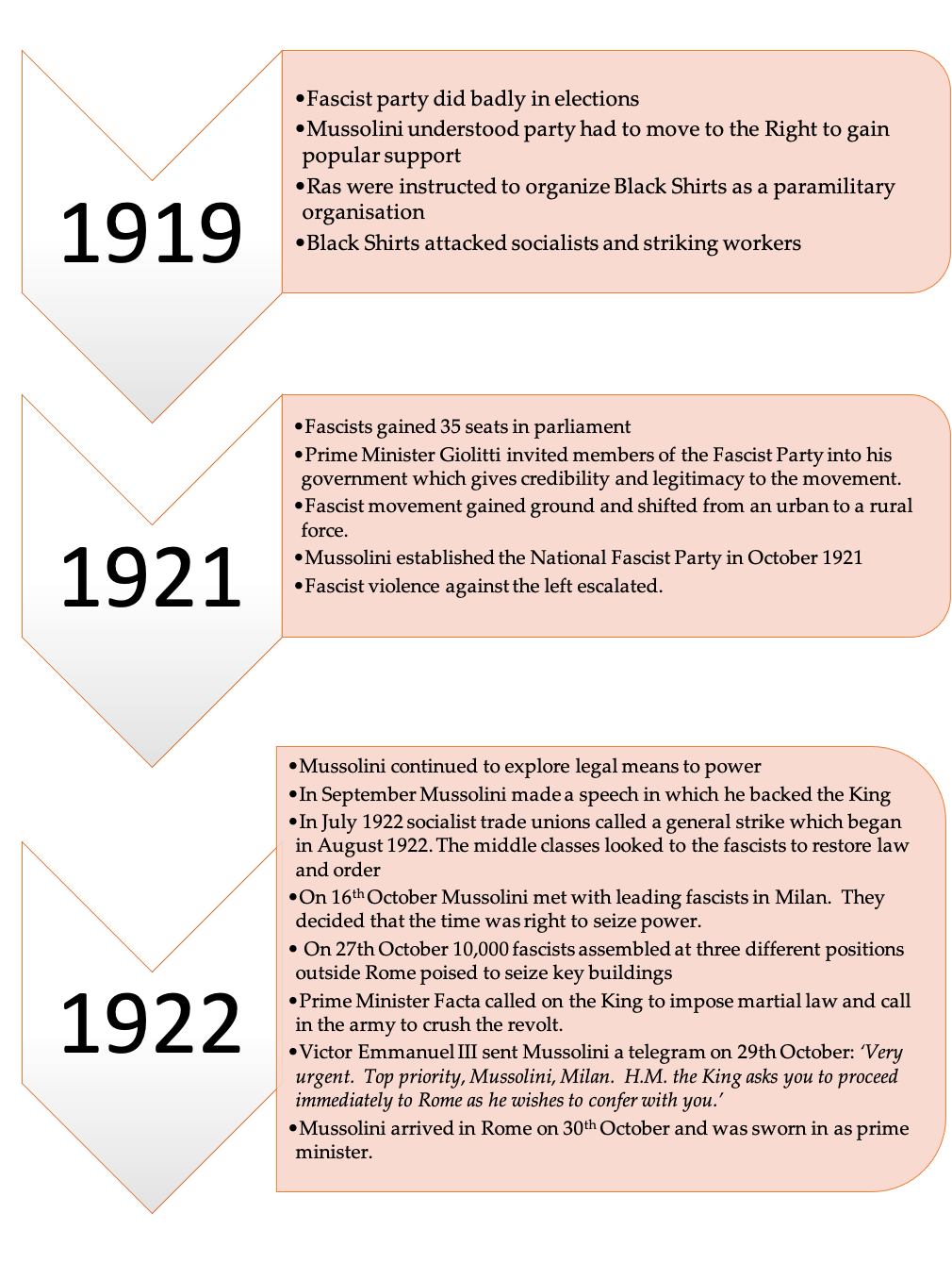 In pairs read through the chart below that outlines the key events leading up to and including Mussolini’s infamous ‘March on Rome’. Discuss with a partner the extent to which his appointment as Prime Minister by King Victor Emmanuel III was due to the use of coercion by Mussolini and the fascists.