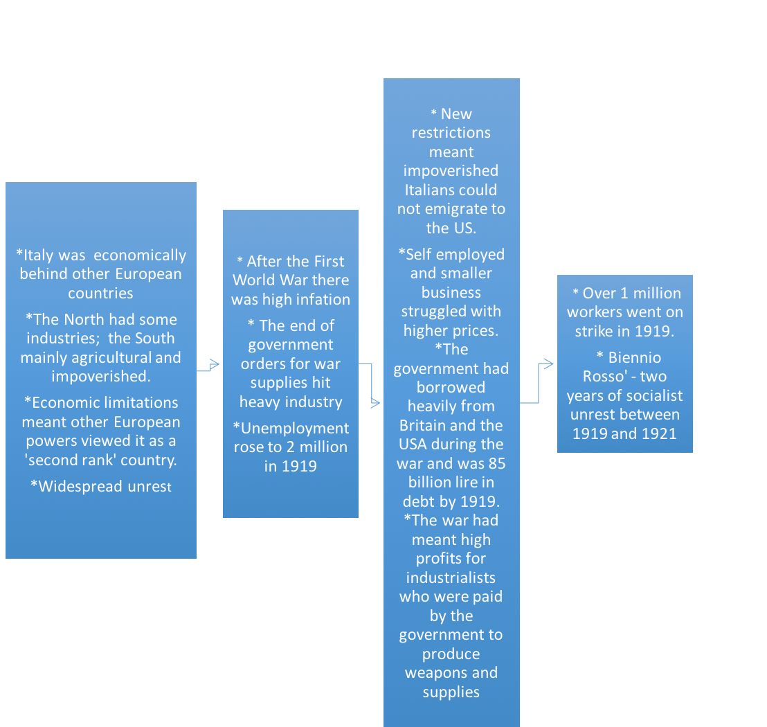 1. What long-term weaknesses in pre First World War Italy contributed to Mussolini's rise to power?