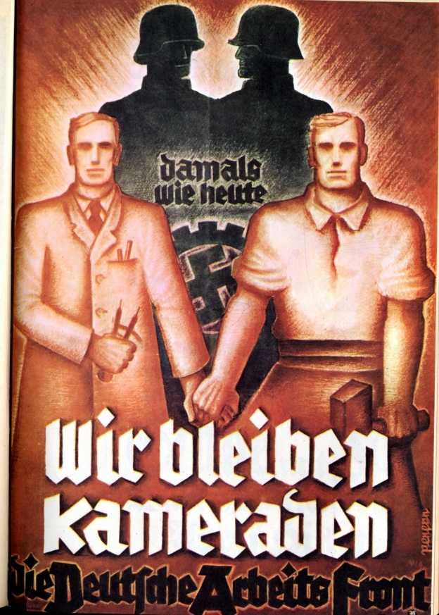 This poster from the Deutches Arbeitsfront (DAF) shows workers hand in hand with the caption 'We stay as comrades'.