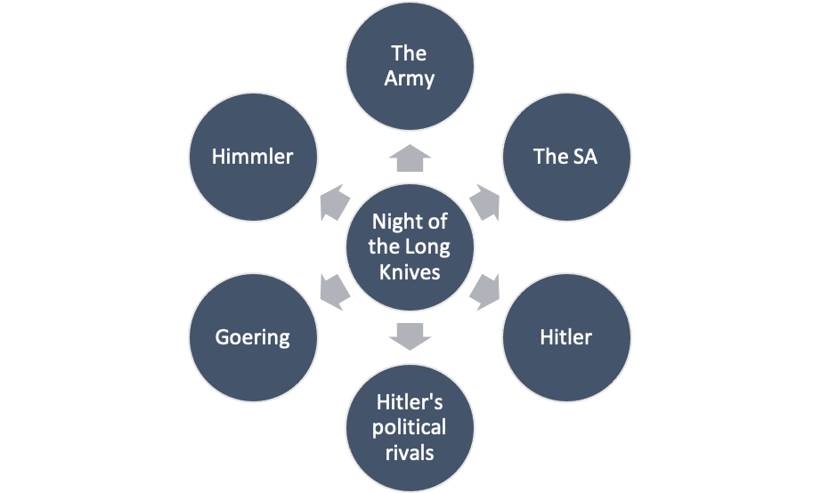 Research further the impact of the Night of the Long Knives. Then copy out and complete the mind map to show the impact of this event on key groups and individuals.