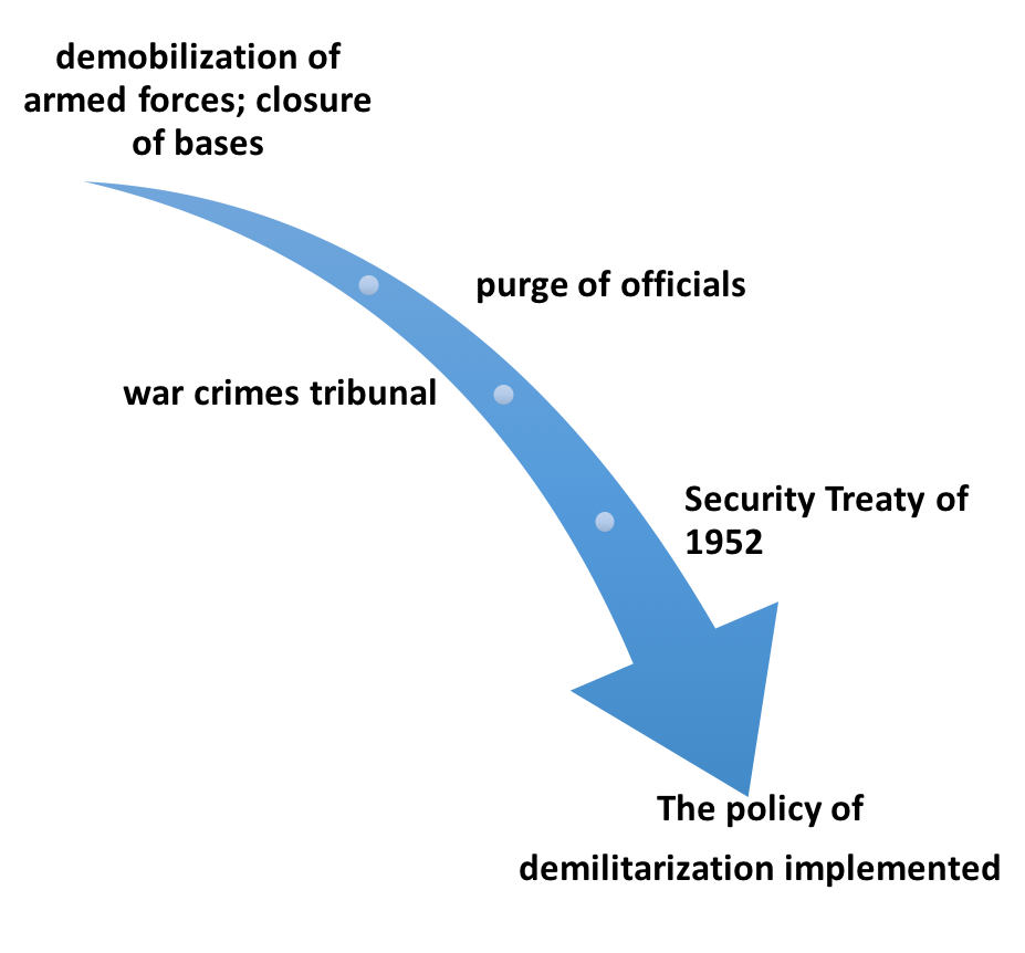 - The demilitarization of Japan was achieved by the demobilization of the military and through Article IX of the constitution. After the occupation Japan had no independent capacity for aggression