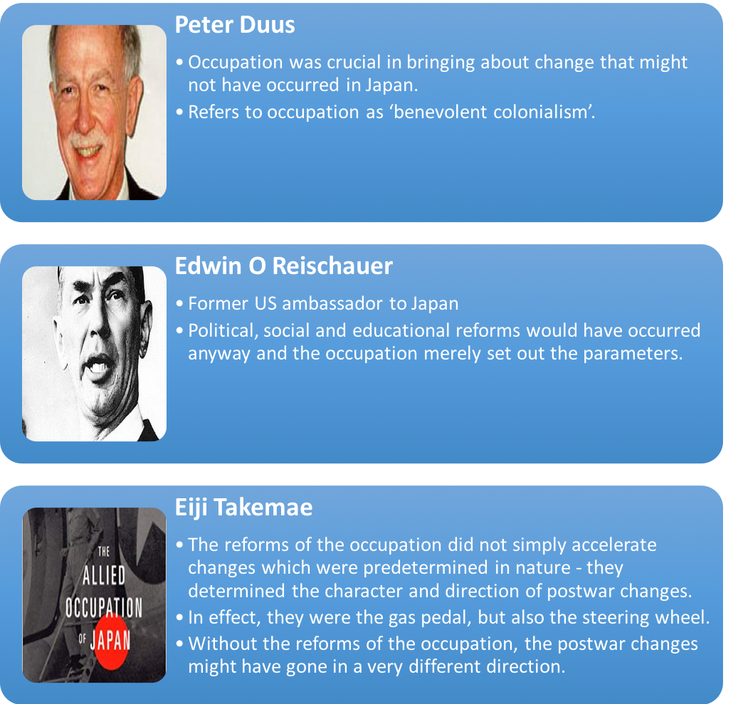 - Historian R Ward suggests that most US scholars in 1950s and 1960s viewed the occupation as a positive example of ‘planned political change’ that successfully built on pre-war developments. To what extent do you agree with this viewpoint?