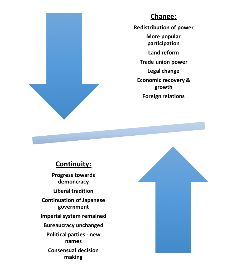 1. In pairs read through the chart above and discuss the balance of change and continuity in Japan by the end of the occupation.