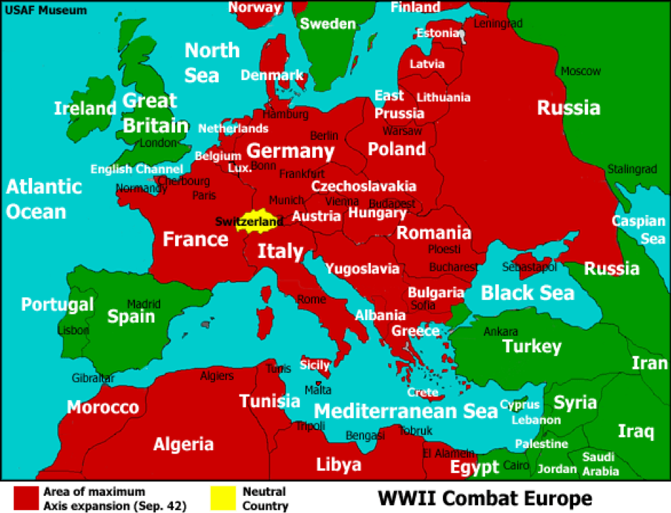 By September 1942 the Axis powers had occupied the territories in red on the map. Central and eastern Europe was under Nazi control.