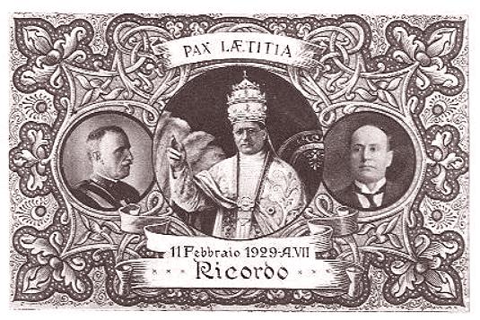 To achieve these aims Mussolini had to address the power and influence of the Catholic Church. As you have seen, he adopted a conciliatory approach towards the Church, as he believed that with its backing his personal control would be strengthened, and the credibility of his fascist regime internationally would improve. As he consolidated his control, Mussolini restored Catholic control of education and increased the state payments to priests in return for the Pope’s withdrawal of support for the Populari. However, the key understanding with the church did not come until 1929, with the Lateran Agreements. There had been resentment, between the church and the Italian state since the period of unification when the Pope’s territories of Rome and the Papal states had been seized. The terms of the treaty component of the Lateran agreements set down terms to heal this rift; the Pope recognized the Italian state and its control of Rome and the Papal States, and in return the state recognized the Pope’s control over the Vatican City [part of Rome], its independence and gave financial compensation for the lost territories of £30 million.