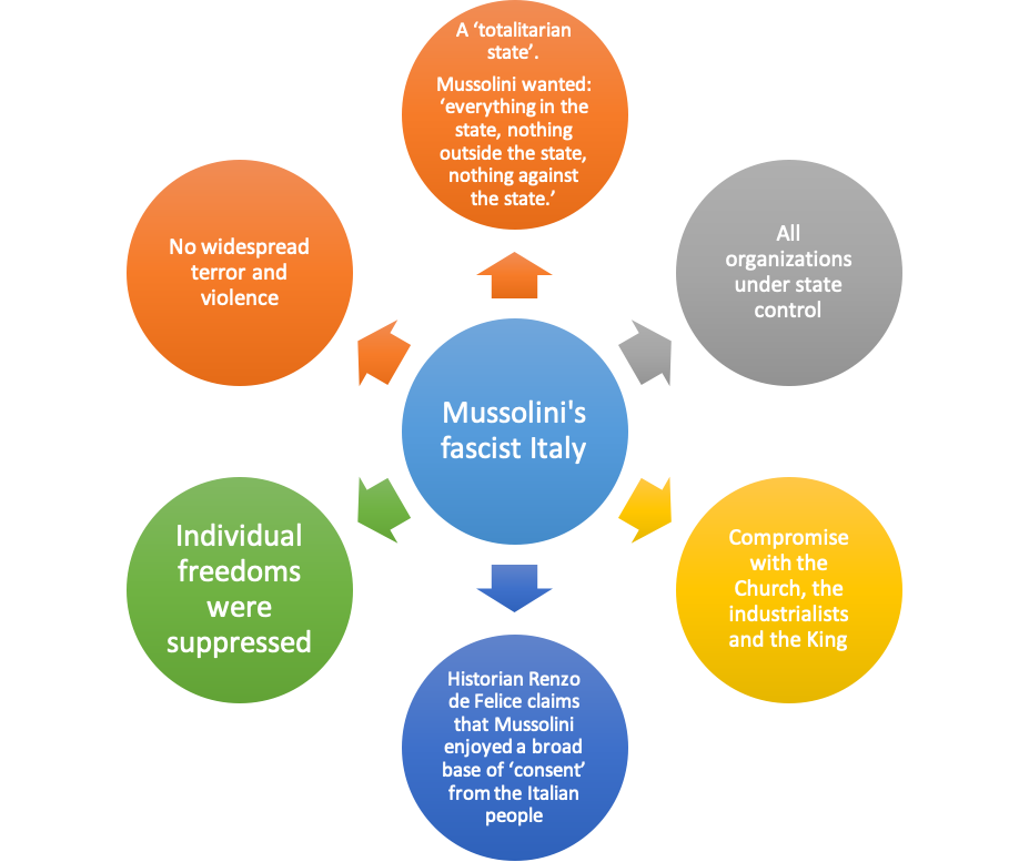 In pairs read through the information below on the mind map. Copy out and add examples, dates and details from the material you have covered and researched in this unit (or create your own infographic) to explain the nature of Mussolini’s fascist state.