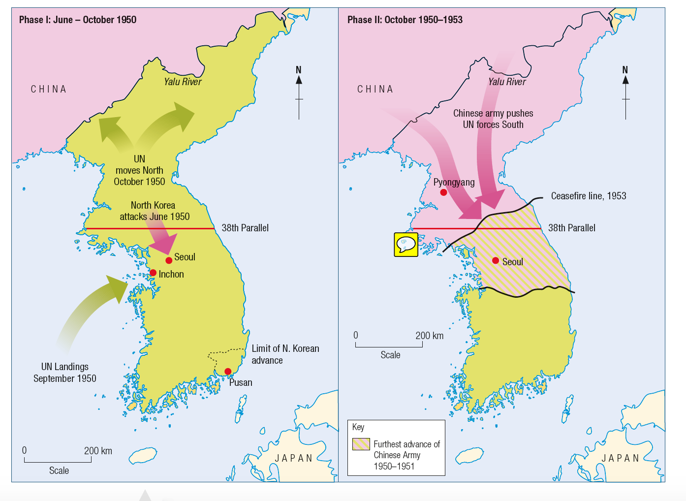 These maps show Phase 1 and Phase 2 of the Korean War.