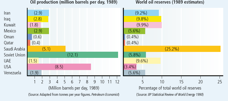 Saddam Hussein had miscalculated first on the USA’s reaction to the invasion. Not only was this an act of aggression by one UN country against another, but the appropriation of Kuwait’s oilfields meant that Iraq would now have an unacceptable level of influence in OPEC and the pricing of oil worldwide. There was also now the possibility of an attack on Saudi Arabia, which would place virtually all Arab oil under Iraq’s control (see graph above) and cause economic and political instability in the region. As the USA relied on imports for about 50 per cent of its oil requirements, it could not afford to let one country, especially one with a leader such as Saddam Hussein, have such control. American allies in the West were also highly alarmed and ready to join the USA in confronting the Iraqi regime. Given the new international context with the ending of the Cold War, Saddam could not even rely on support from the USSR.