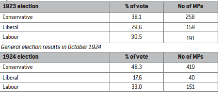 The Conservatives were the dominant force in the 1920s, and indeed would continue to be so until the outbreak of war in 1939. Following their influential position in Lloyd George’s coalition from 1918 to 1922, they went on, after their break from the Liberals, to form the government of Britain up to 1929. The only exception was the nine-month period that you have just read about, under the Labour government.