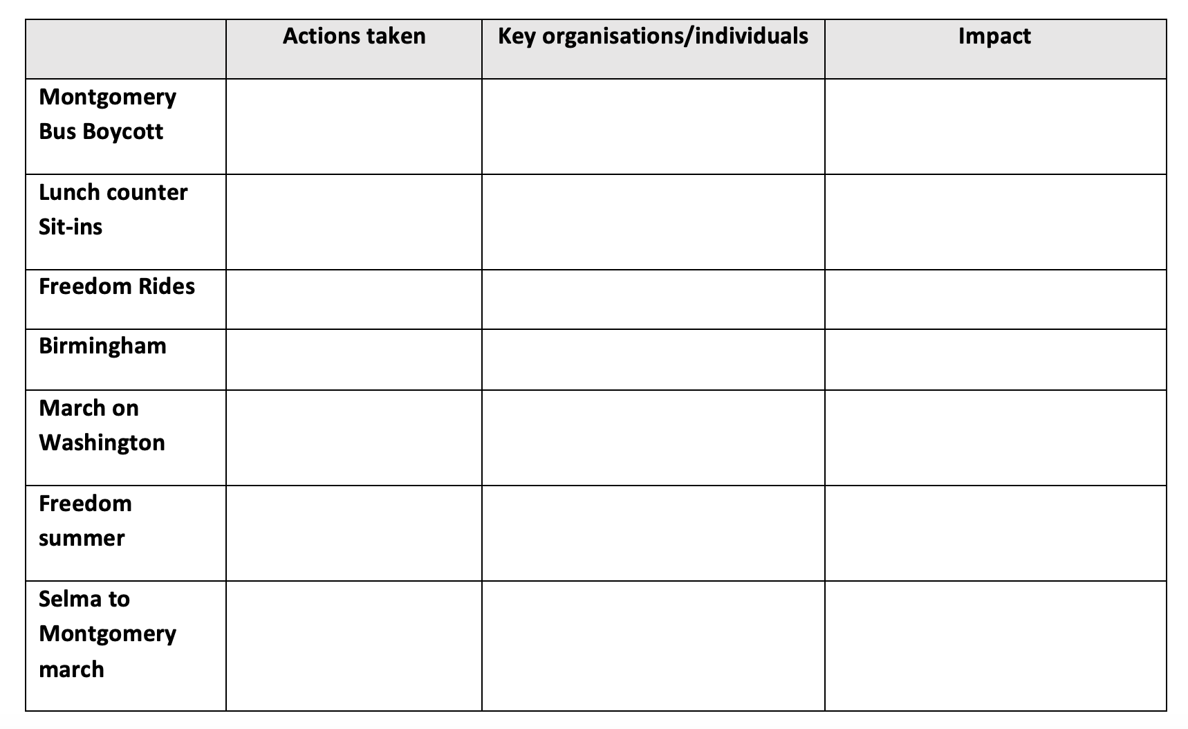 Review all of the examples of direct action given above; copy out and complete the grid below or print off the PDF