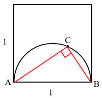 (a) Firstly, wherever point C is located, angle A and angle B of triangle ABC must both be acute angles. Hence, angle C must be obtuse for triangle ABC to be an obtuse triangle. Secondly, the probability of point C being inside a region where angle C is obtuse is the ratio of the area of that region to the area of the square. Since the area of the square is one, the probability of C lying in a particular region is the area of the region itself. Thirdly, an angle inscribed in a semicircle is a right angle (see figure). Hence, if C is in the semicircle then triangle ABC is obtuse. The area of the semicircle is \(\frac{1}{2}{\textrm{\pi }}{r^2} = \frac{1}{2}{\textrm{\pi }}{\left( {\frac{1}{2}} \right)^2} = \frac{{\textrm{\pi }}}{8}\). Therefore, if C is a randomly chosen point in the interior of the square then the probability that triangle ABC is obtuse is \(\frac{{\textrm{\pi }}}{8} \approx 0.393\)