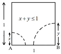 Given \(0 < x < 1\) and \(0 < y < 1\), \(x\) and \(y\) are the coordinates of a point inside a unit square with vertices at \(\left( {0,0} \right),\;\left( {1,0} \right),\;\left( {1,1} \right)\) and \(\left( {0,1} \right)\). The points in this square that also satisfy (i) \(x + y > 1\) are in the shaded triangle above the line \(x + y = 1\) (figure right). Points that satisfy (ii) \({x^2} + {y^2} < 1\) must lie in the unit circle with centre at \(\left( {0,0} \right)\). Thus, the set of points that satisfy all four conditions are in the region where the unit circle overlaps the shaded triangle. This region (a segment of the unit circle) is shown in the figure below; and its area is given by the area of the triangle with vertices \(\left( {0,0} \right),\;\left( {1,0} \right)\) and \(\left( {0,1} \right)\) subtracted from the quarter unit circle. Therefore, the probability that x, y and 1 are the sides of a obtuse triangle is \(\frac{1}{4}{\textrm{\pi }}\left( {{1^2}} \right) - \frac{1}{2}\left( 1 \right)\left( 1 \right) = \frac{{\textrm{\pi }}}{4} - \frac{1}{2} = \frac{{{\textrm{\pi }} - 2}}{4}\).