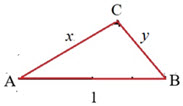 (b) For triangle ABC (\({\textrm{AC}} = x\), \({\textrm{BC}} = y\) and \({\textrm{AB}} = 1\)) to be obtuse, two conditions must be satisfied. Firstly, for the line segments with lengths of \(x\), \(y\) and 1 to form a triangle it must be that \(x + y > 1\). If \(x + y \le 1\), then the circle with centre at A and radius \(x\) will not intersect the circle with centre at B and radius \(y\). So, the first condition that must be met is \(x + y > 1\).